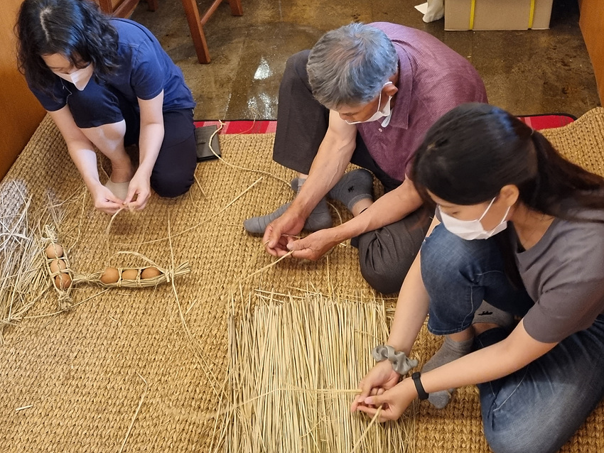 속초오실에 참여한 참가자들이 짚풀공예 체험을 하고 있다. (사진 = 속초시)