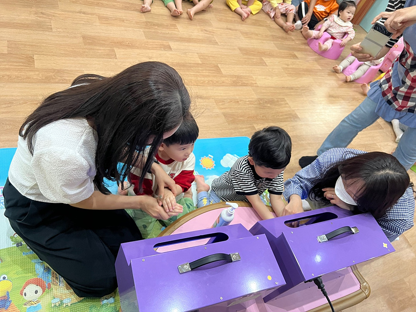 시는 손을 씻은 뒤 남아 있는 형광물질(세균)을 눈으로 확인할 수 있는 뷰 박스(view box) 체험 교육과 옷소매로 입을 가리고 하는 기침 예절 눈높이 교육을 통해 감염병 예방효과를 기대하고 있다.