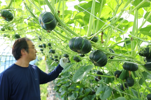 (전남=NSP통신) 김현 기자 = 해남의 대표 특화작목인 공중재배 미니 밤호박 수확이 시작됐다.