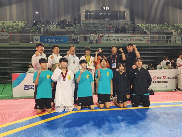 NSP통신-전남체육중 서민준 학생이 사전경기로 진행된 태권도에서 금메달을 따낸 뒤 동료 선수, 학교 관계자와 함께 기념촬영을 하고 있다. (사진 = 전남교육청)