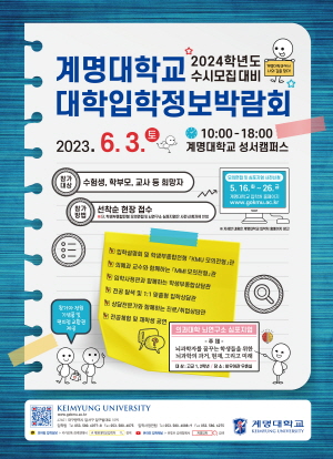 오는 6월 3일 오전 10시부터 6시까지 계명대 성서캠퍼스 바우어관과 봉경관에서 진행되는 이번 입학정보박람회는 ‘계명대학교에서 나의 길을 찾는다’를 주제로 수험생과 학부모들을 대상으로 적성과 진로에 맞는 전공탐방과 대학입시를 위한 합격전략 정보를 한자리에서 확인할 수 있다.