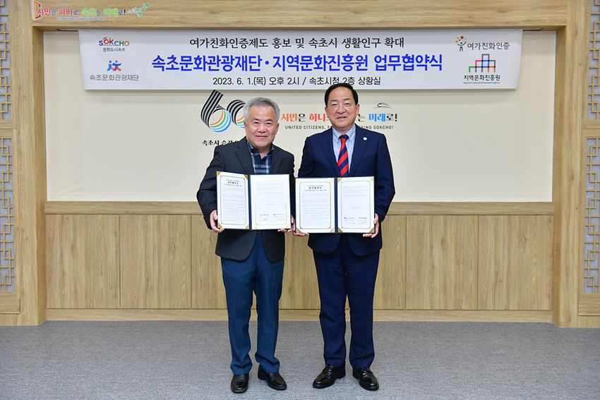 이번 업무협약은 시와 속초문화관광재단이 지역 지속성을 위한 생활인구 확대 방안 중 하나로 여가친화인증제도 활성화를 지역문화진흥원에 제안하고 지역문화진흥원도 여가친화인증제도의 홍보와 여가친화인증사에 대한 혜택 확대 필요성에 동의해 협약을 진행했다.