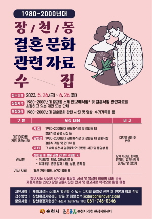 (전남=NSP통신) 위종선 기자 = 순천시(시장 노관규)는 오는 26일까지 1980년에서 2000년대 장천동 지역의 결혼문화와 관련된 자료를 수집한다.