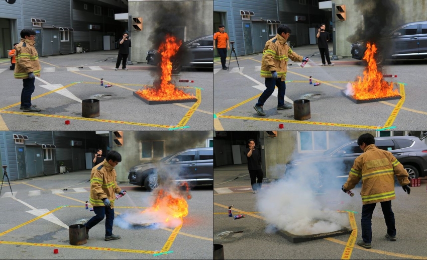 또 개발사 황인천 한국방염기술 대표가 각 화재에서 ‘스프레이식 액상 소화기’로 화재진압 하는 상황을 시연했다.