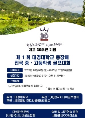 대경대학교가 주최하고 사단법인한국시니어골프협회가 주관하는 이번 대회는 대경대학교 개교 30주년을 기념하고 교육과 골프의 융합을 통해 우수 유망주 발굴과 유망한 골프선수로 성장할 수 있는 기회 제공을 위해 개최 될 예정이다.