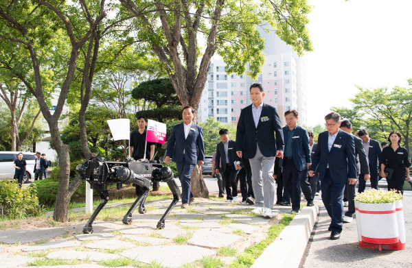 김장호 시장은 출근길 시청 입구에서 간부공무원들과 새로 조성한 시청 산책로를 4족 보행로봇 '비전60' 과 함께 걸으며 앞으로 이룩해 나갈 산업혁신을 위한 또 한 걸음을 내딛었다.