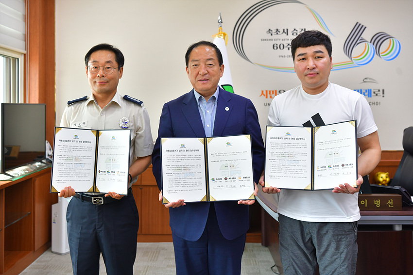 시는 6일 시청에서 심정지 등 응급상황 발생 시 신속 대응으로 시민과 관광객 생명을 보호하기 위해 속초소방서, 이마트 24 아바이마을점 경영주와 자동심장충격기 설치 및 관리 업무협약을 체결했다.
