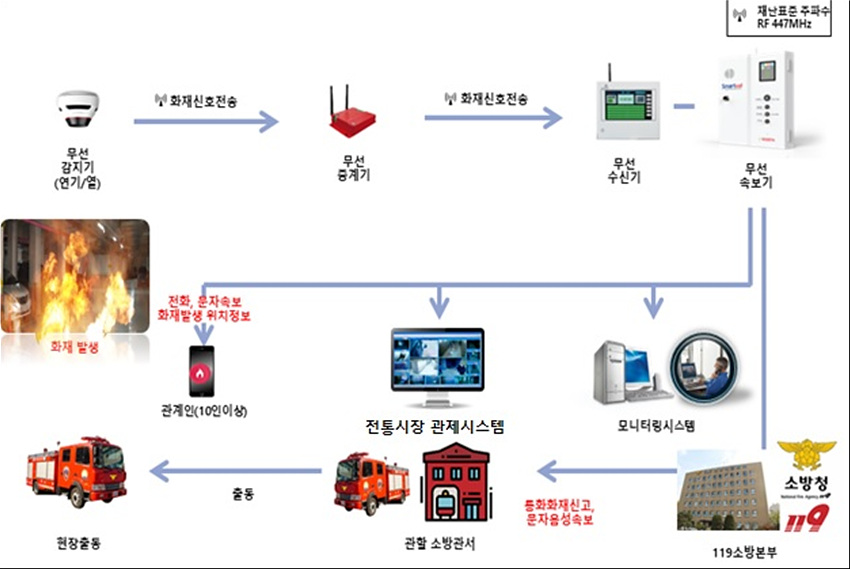 스마트 화재알림시설은 경보와 동시에 소방서와 시장 상인회, 시 담당자에게 전화와 문자로 화재 정보를 알리는 역할을 한다.