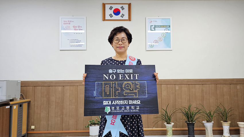 (강원=NSP통신) 조이호 기자 = 강릉 경포고등학교 이상녀 교장이 10일 마약범죄 예방을 위한 ‘NO EXIT’ 릴레이 캠페인에 동참했다.