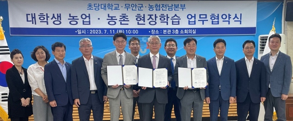 (전남=NSP통신) 김용재 기자 = 농협전남본부(본부장 박종탁)는 11일 초당대에서 무안군(군수 김산)과 초당대(총장 박종구) 관계자 10여 명이 참석한 가운데 대학생 농촌 봉사활동을 학점 이수 과정으로 반영하는 업무 협약식을 가졌다.
