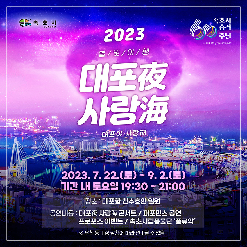 (강원=NSP통신) 조이호 기자 = 강원특별자치도 속초시(시장 이병선)가 오는 22일부터 9월2일까지 매주 토요일 ‘2023 별빛야행 대포夜 사랑海’를 진행한다.