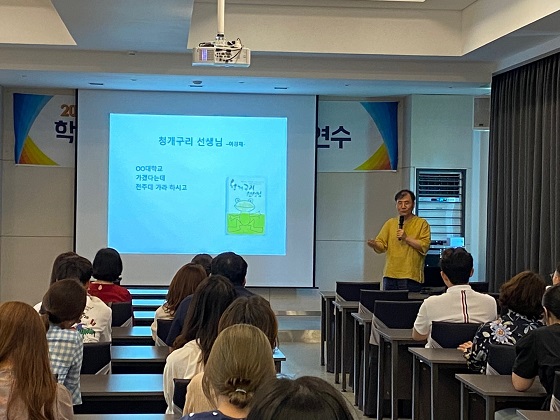 전남 담양 드몽드호텔에서 열린 이날 특강에서 이경재 학장은 ‘땡땡이 넝쿨장미’ 등 재미있는 시들을 통해 한 학기를 마치고 방학에 들어가는 교사들에게 위로와 행복의 메시지를 전했다.