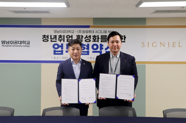 (대구=NSP통신) 최병수 기자 = 영남이공대학교(총장 이재용)는 호텔롯데 시그니엘 부산 회의실에서 호텔롯데 시그니엘 부산과 청년취업 활성화를 위한 업무협약을 체결했다고 26일 밝혔다.
