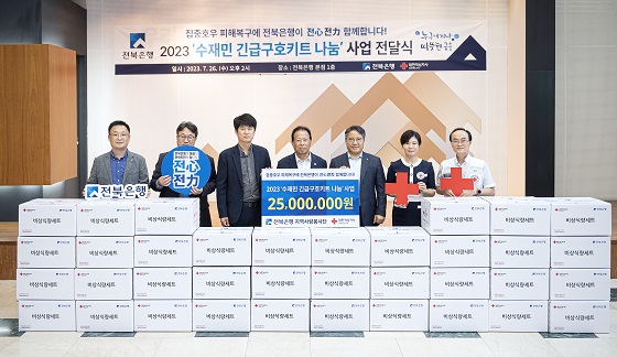 전북은행지역사랑봉사단 30여명은 지난 22일 대한적십자사 전북지사에서 2500만원 상당 긴급구호키트를 직접 포장하는 봉사활동을 펼쳤으며, 올해 제작한 수량은 대한적십자사 전북지사와 함께 신속히 수재민들에게 전달해 빠른 일상회복을 도울 예정이다.