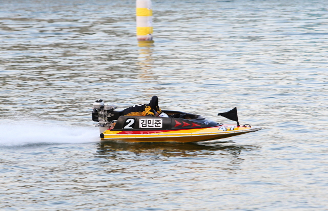 미사리경정장에서 김민준 선수가 선두로 결승선을 향해 질주하고 있다. (사진 = 국민체육진흥공단)