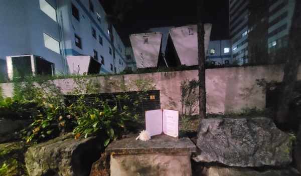 김영호 전 국민의힘 고양시정 청년위원장이 자신이 처음으로 1인 시위를 시작했던 곳에 놓아둔 청년위원장 임명장과 국화 한송이 (사진 = 강은태 기자)