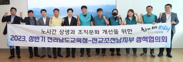 (전남=NSP통신) 김용재 기자 = 전남도교육청(교육감 김대중)과 전국교직원노동조합 전남지부(지부장 신왕식)가 9일 전남도교육청에서 ‘2023년 상반기 정책협의회 체결식’을 가졌다.