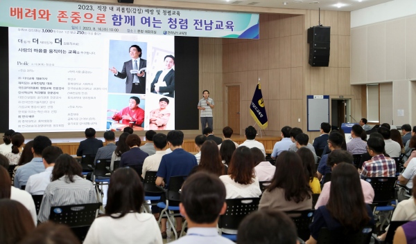 (전남=NSP통신) 김용재 기자 = 전남도교육청(교육감 김대중)이 16일 청사 2층 대회의실에서 본청 전 직원을 대상으로‘2023년 직장 내 괴롭힘(갑질) 예방 청렴 교육’을 실시했다.