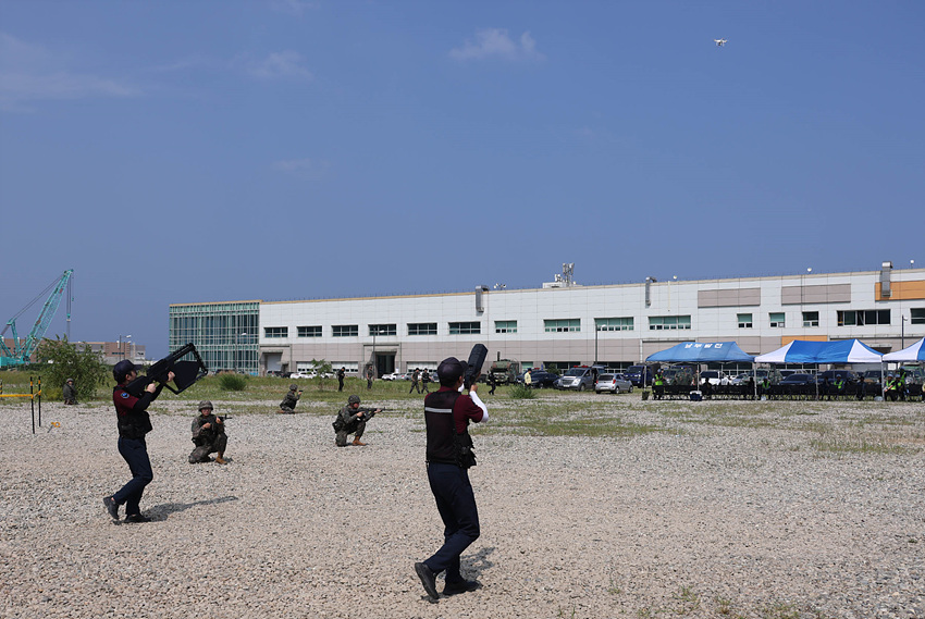 훈련은 본부 내 용수환경동 앞에서 적의 드론 테러로 인한 화재 발생을 가정해 각 기관의 합동 대응훈련으로 이뤄졌다.