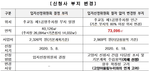 심지어 청사 공간은 당초 의결된 부지인 주교동 제1공영주차장 부지가 아닌 대장천 아래쪽(남쪽) 추가 확장된 공간만으로 계획하는 등 중대한 변경 사항이 발생 했지만 이 전 고양시장 등은 신청사 예정지로 결정하면서도 입지선정위원회의 변경 심의‧의결 절차를 거치지 않았다.