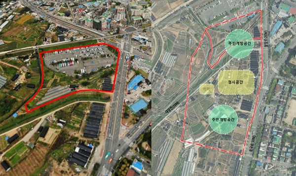 NSP통신-입지선정위원회가 결정한 주교동 제1공영주차장 부지 일원(좌)과 입지선정위원회의 절차 없이 대폭 증가된 변경된 주교동 제1공영주차장 인근(우) 모습 (사진 = 고양시)