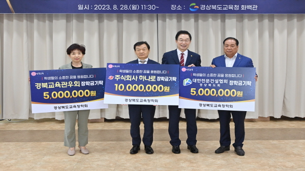 또한 전문건설업계의 더 나은 미래를 위해 노력하는 대한전문건설협회 경상북도회(회장 이정철)와 경북교육청 5급 이상 공무원으로 구성된 경북교육관우회(회장 백영애)에서 각각 500만 원의 장학금을 전달했다.