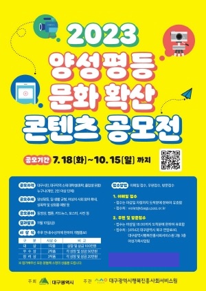 (대구=NSP통신) 최병수 기자 = 대구시가 주최하고 대구시행복진흥사회서비스원(원장 정순천, 이하 대구행복진흥원)이 주관하는 2023년 ‘양성평등 문화 확산 콘텐츠 공모전’이 오는 10월 15일까지 열린다.