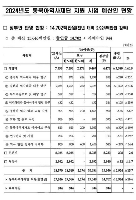 안민석 더불어민주당 국회의원(교육위원회)이 공개한 ‘2024 년도 동북아역사재단 지원 사업 예산황’에 따르면 동북아역사재단의 일본의 역사왜곡 대응 연구 사업 예산은 2024년 73%(14억9000만원) 삭감돼 사업 차질이 불가피해졌다.