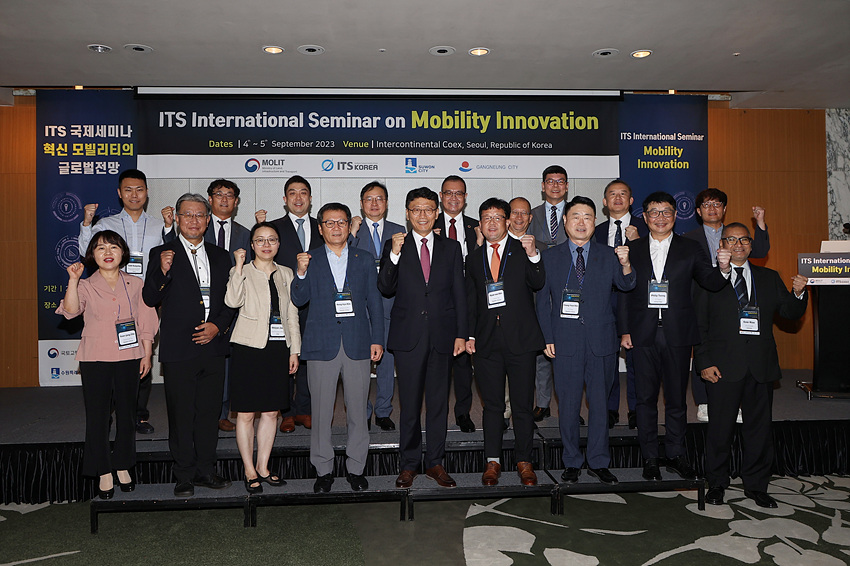 김홍규 강릉시장이 2023년 ITS 국제세미나에 참석 후 기념사진 촬영을 하고 있다. (사진 = 강릉시)