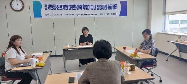 원광디지털대학교 상담심리학과 교수를 초빙해 진행한 이번 컨설팅은 다문화가족 학령기 자녀들이 겪을 수 있는 가정 내 문제, 학업, 교우관계 등 다양한 주제에 대해 실무자가 개인상담·집단상담, 심리검사 및 진로특강, 컨설팅 학습상담 등을 진행할 때보다 나은 서비스를 제공하고자 진행했다.
