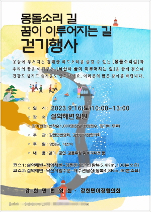 (강원=NSP통신) 조이호 기자 = 강원특별자치도 양양군(군수 김진하)이 16일 오전 10시부터 양양 설악해변 백사장에서 ‘몽돌소리 길&꿈이 이루어지는 길’ 걷기행사를 개최한다.