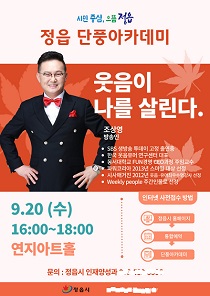 (전북=NSP통신) 김광석 기자 = 전북 정읍시가 오는 20일 오후 4시 연지아트홀에서 웃음치료사 조상영 강사를 초청해 ‘웃음이 나를 살린다’라는 주제로 제109회 정읍 단풍아카데미를 개최한다.