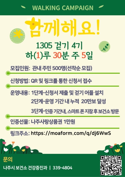 나주시는 오는 25일부터 27일까지 ‘따로 또 같이! 1305(하루에 30분 주 5일 걷기) 건강걷기 챌린지’ 4기 사업 참여자 500명을 선착순 모집한다.