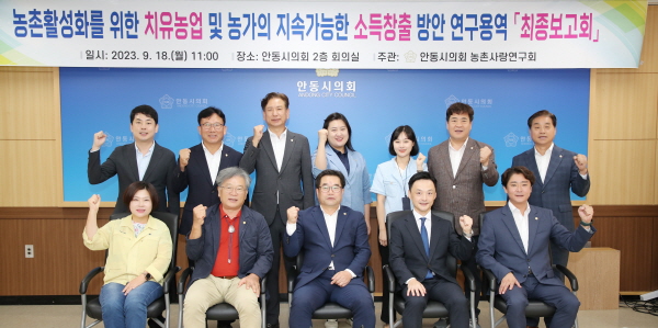 (경북=NSP통신) 김오현 기자 = 안동시의회 의원 연구단체인 농촌사랑연구회(회장 권기탁)는 18일 안동시의회 회의실에서 ‘농촌 활성화를 위한 치유농업 및 농가의 지속 가능한 소득 창출 방안 연구용역 최종보고회’를 개최했다.