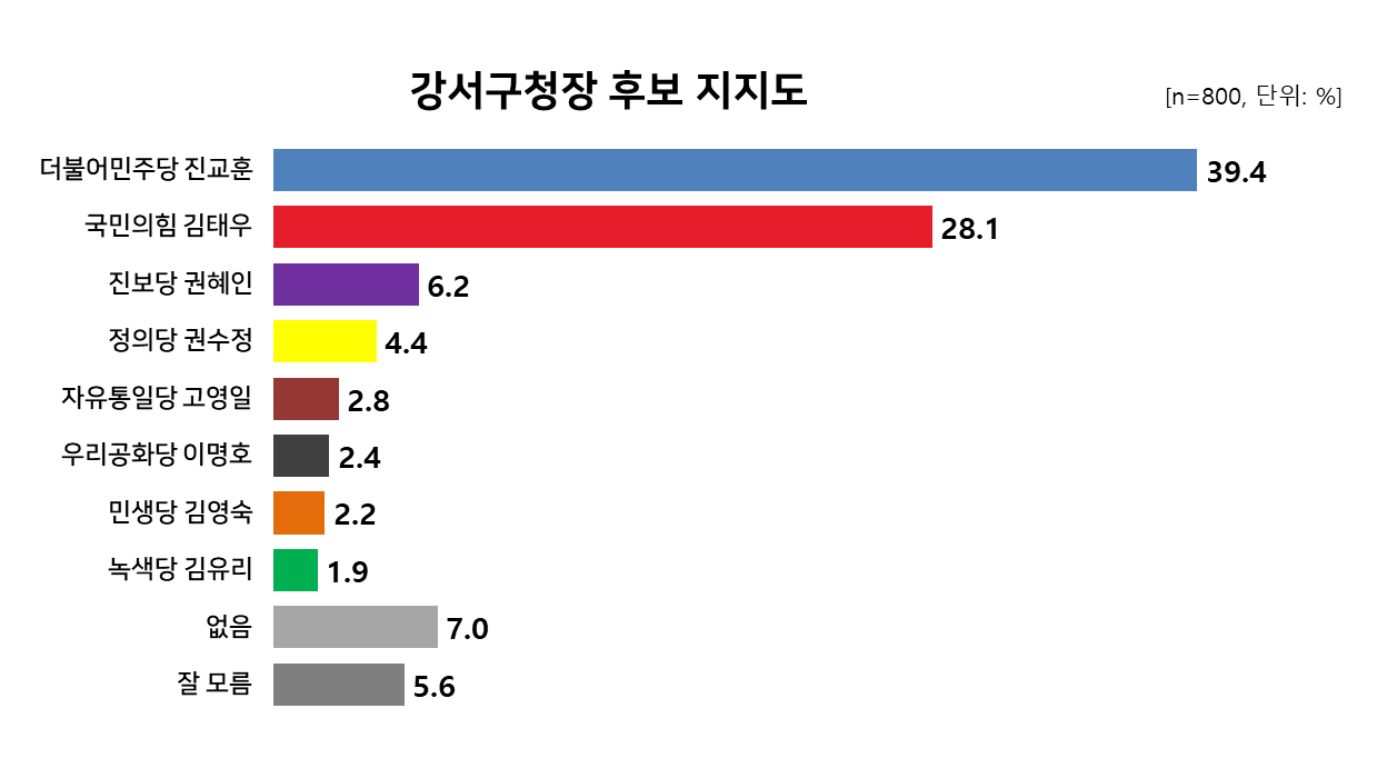 이번 조사는 11일부터 12일까지 이틀간 서울 강서구 만 18세 이상 유권자 800명을 대상으로 무선가상번호(80%)·유선 RDD(20%) 표집틀을 통한 자동응답 방식으로 진행됐다. 응답률은 2.0%였다. 표본오차는 95% 신뢰수준에서 ±3.5%p다.