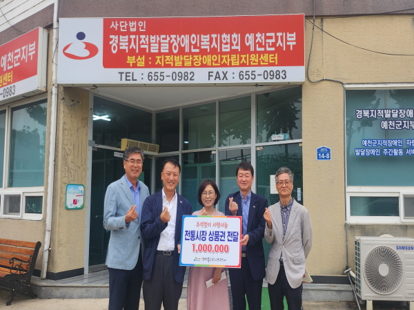 이번 ‘추석맞이 이웃사랑 나눔행사’ 는 수해로 큰 피해를 입은 예천지역 주민들을 위로하고 조속한 일상회복을 돕고자 경북지적발달장애인복지협회 예천군지부를 찾아 100만 원 상당의 온누리상품권을 전달했다.