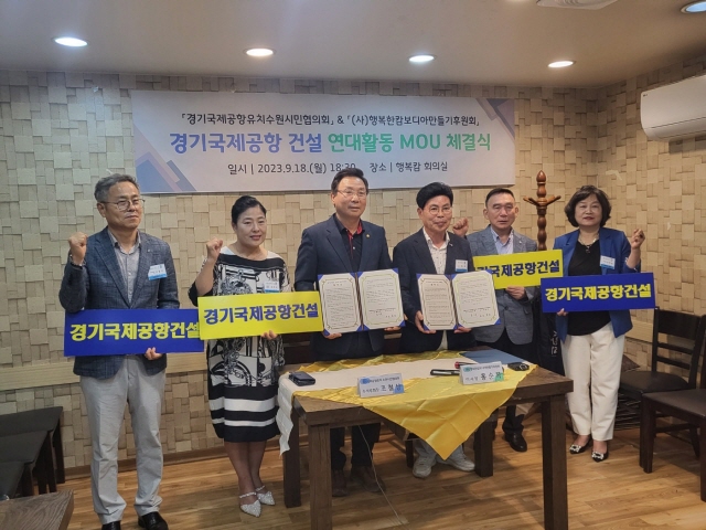 (경기=NSP통신) 조현철 기자 = 경기국제공항유치수원시민협의회가 18일 수원시통장협의회, 수원여고총동문회 및 행복한캄보디아만들기후원회 등 3개 단체와 경기국제공항 건설 및 지역발전을 위한 연대활동 협약(MOU)을 체결했다.