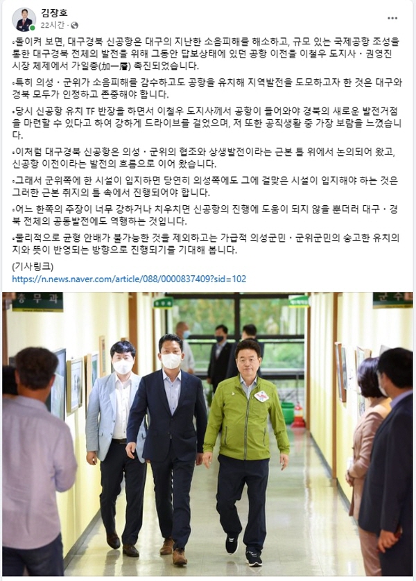 김 시장은 지난 25일 자신의 SNS에 “의성·군위가 소음피해를 감수하고도 공항을 유치해 지역발전을 도모하고자 한 것은 대구와 경북 모두가 인정하고 존중해야 한다”면서 “대구경북신공항은 의성·군위의 협조와 상생발전이라는 근본 틀 위에서 논의되어 왔고, 신공항 이전이라는 발전의 흐름으로 이어 왔다”고 강조했다.