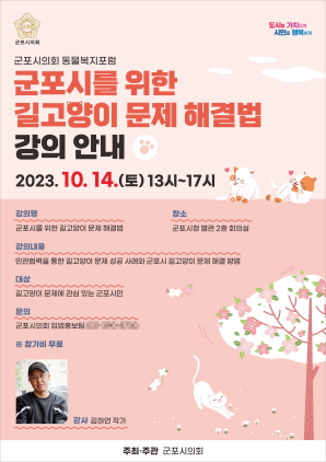 시의회는 오는 14일 오후 1시부터 군포시청 별관 2층 회의실에서 ‘군포시를 위한 길고양이 문제 해결법’이라는 주제의 강의를 진행한다.
