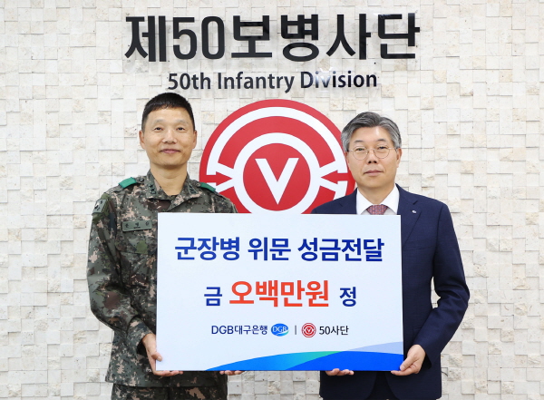지난 11일 전달된 성금은 DGB대구은행이 50사단과 체결한 ‘1사1병영’ 업무협약에 따른 것으로, 위문 성금은 군 장병들의 사기진작 및 복지증진을 위해 쓰일 예정이다.
