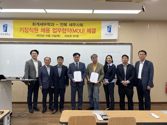 전주대 경영대학에서 열린 이번 협약식은 전북 세무사회 회장과 임원단 4명, 회계세무학과 교수 3명 그리고 30여 명의 회계세무학과 재학생들이 참석한 가운데 진행됐다.