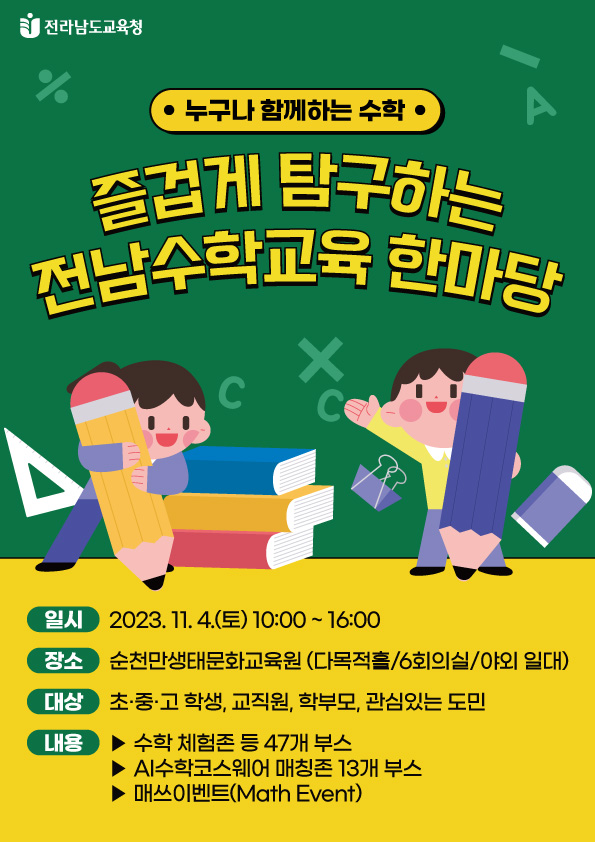 수학이 어렵고 지루한 과목이라는 편견에서 벗어나 즐겁게 탐구하는 체험중심의 수학문화를 전남 교육가족 및 도민들에게 알리는 축제의 한마당으로 펼쳐진다.