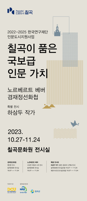 이어 10월 27일부터 11월 24일까지 칠곡문화원 전시실에서 ‘겸재 정선 화첩 영인본 전시회’ ‘노르베르트 베버의 고요한 아침의 나라 전시회’ ‘하삼두 명상그림(증언-칠곡의 나무들 전시회(2점)’가 열린다. 같은 날 왜관수도원에서 ‘하삼두 명상그림(증언-칠곡의 나무들) 전시회(28점)’이 왜관수도원에서 진행된다.