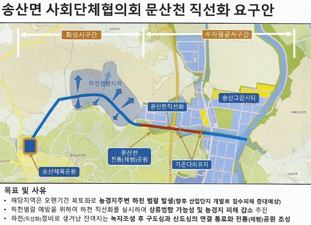 수차례 나열했듯이 문산천 상류 부분의 개인사유지 1만여 평은 송산면 지역발전위원회의 문산천 직선화를 요구했던 안을 화성시 지역개발사업소와 한국수자원공사가 받아들여 지역발전위가 땅 소유주를 설득해 수용을 허락한 일이다.
