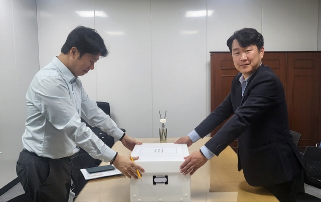 18일 이유재 화서동말지구 재개발추진위원장(오른쪽)이 공공재개발 동의서를 수원도시공사에 최초로 접수하는 모습. (사진 = 김종식 기자)