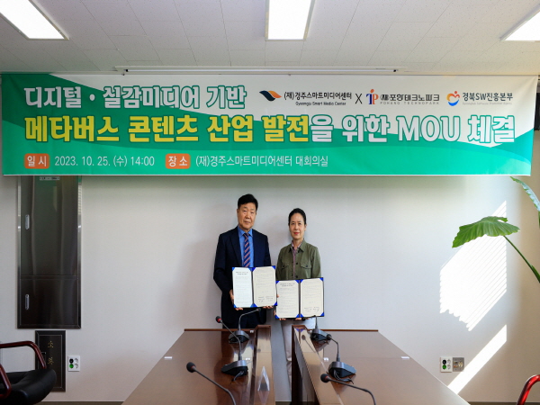 (경북=NSP통신) 조인호 기자 = 경주스마트미디어센터는 포항테크노파크와 함께 디지털·실감미디어 기반 메타버스 콘텐츠 산업 발굴을 위해 지난 25일 경주스마트미디어센터에서 업무협약을 체결했다.