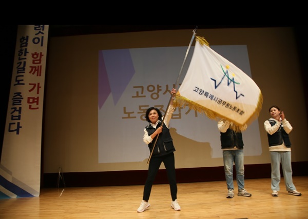 NSP통신-장혜진 위원장이 제2대 고양시청 공무원노조 출범식에서 노조기를 흔들고 있다. (사진 = 고양시 공무원노조)