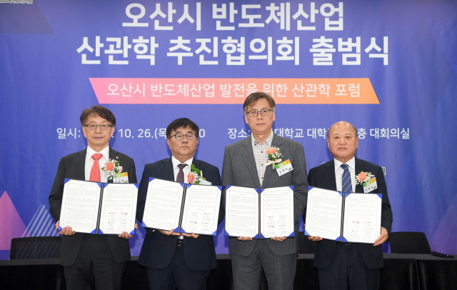 시는 26일 오산대학교에서 ‘오산시 반도체 산업 발전을 위한 업무협약’(MOU)을 체결했다. 업무협약에는 오산상공회의소와 지역내 반도체 기업, 오산대학교, 한신대학교가 참여했다.