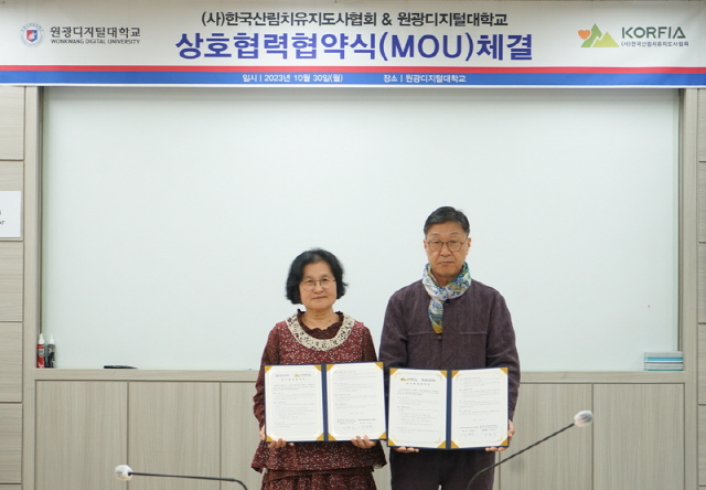 원광디지털대학교와 한국산림치유지도사협회 간 상호협력 업무협약식에서 서종순 대학원장(왼쪽)과 조백수 한국산림치유지도사협회장이 협약 기념촬영을 하고 있다. (사진 = 원광디지털대학교)