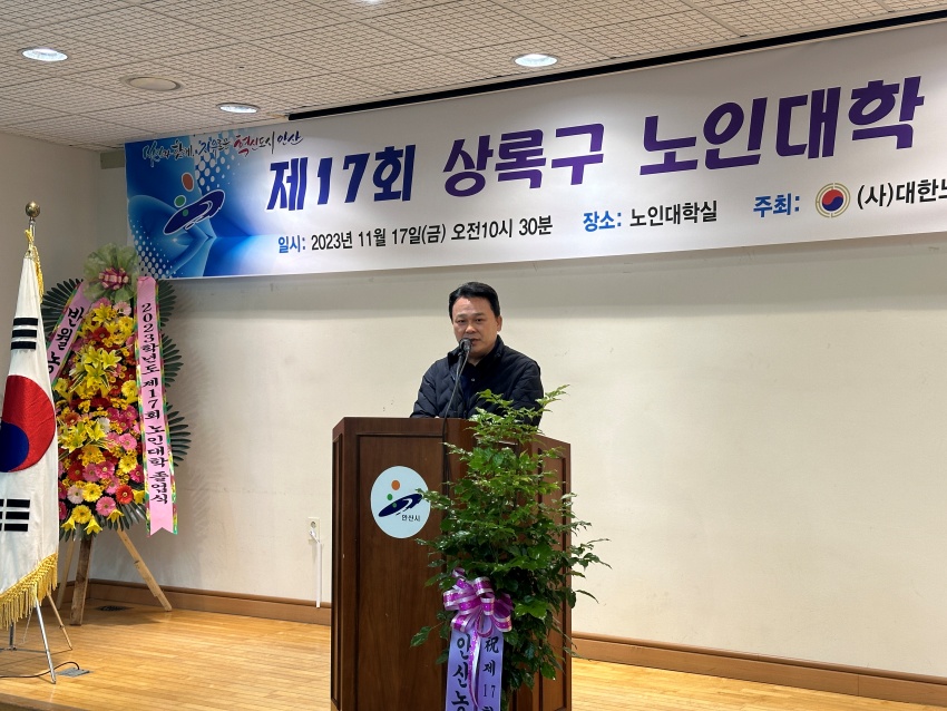 17일 안산시 상록구 노인대학 졸업식에서 인사말하는 김석훈 국힘 안산상록갑 당협위원장. (사진 = 국힘 안산상록갑 당협위원장실)